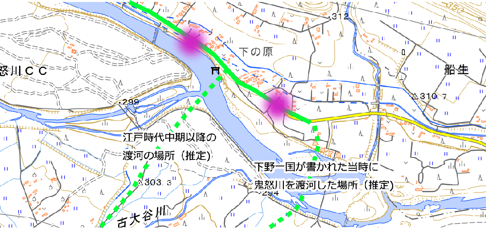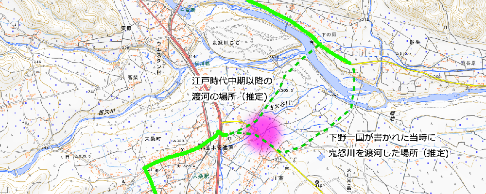 また、下野一国によると大桑村中より鬼怒川までの距離は約2300mであるが、現在の大桑から推定の旧道を通った距離を測ってみると、約2100mほどであった。