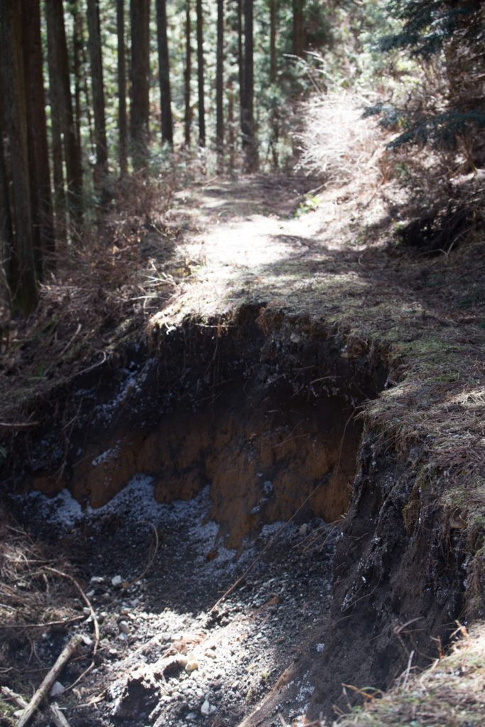 周囲は地震により大きな地形変化があり、またここに立ち入る人がいないため、崖崩れ、地面の隆起のあと、そしてずだずだに裂けた大きな亀裂がほとんど当時のままで残っている。