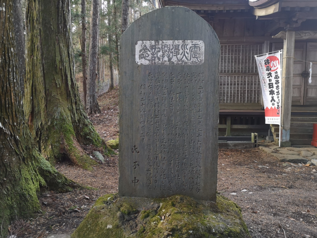 昭和24年12月26日午前8時17分、突如として激震に襲われ山は崩れ大地は裂け、社殿や家屋は傾きあるいは倒れ、甚大な被害を受ける氏子は一体となり三神社の復興に努め社資と氏子の奉仕により磐裂神社雷神宮を復興し、磐裂神社に拝殿を新築して王位神社を合祀し復興奉告祭を昭和26年4月3日執行し、この未曾有の災禍を銘記し碑を建て永久に記念す。