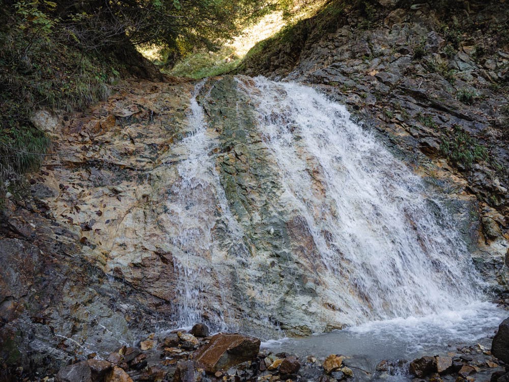 まずは西沢を上流に進んでいく。温泉マークのあるあたりまで100mほど進むと滝があり、斜面を沢が流れている。